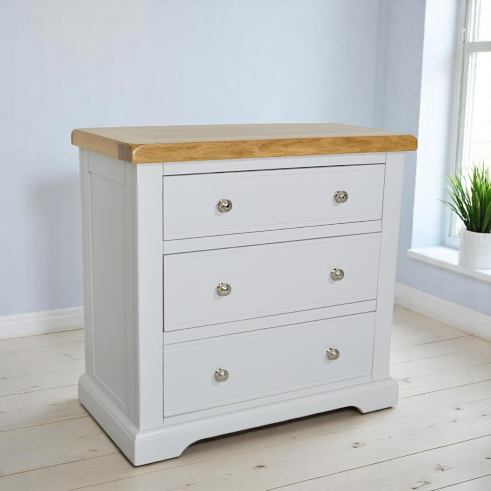 The Furniture Market Cheshire Cream 3 Drawer Compact Chest with Limed Oak Top, Stylish Chrome Metal Cup Handles, Versatile Small Chest or Large Bedside Table - H 785 x W 765 x D 430mm