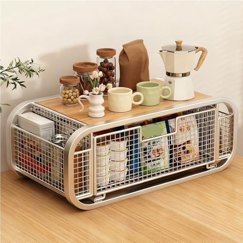 Countertop Organizer Shelf with Drawer – Metal & Wood Microwave Stand & Coffee Station for Kitchen, Dorm or Home Office