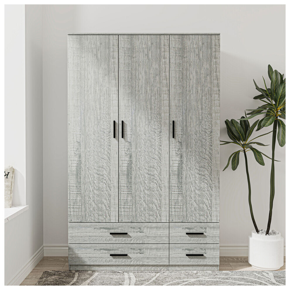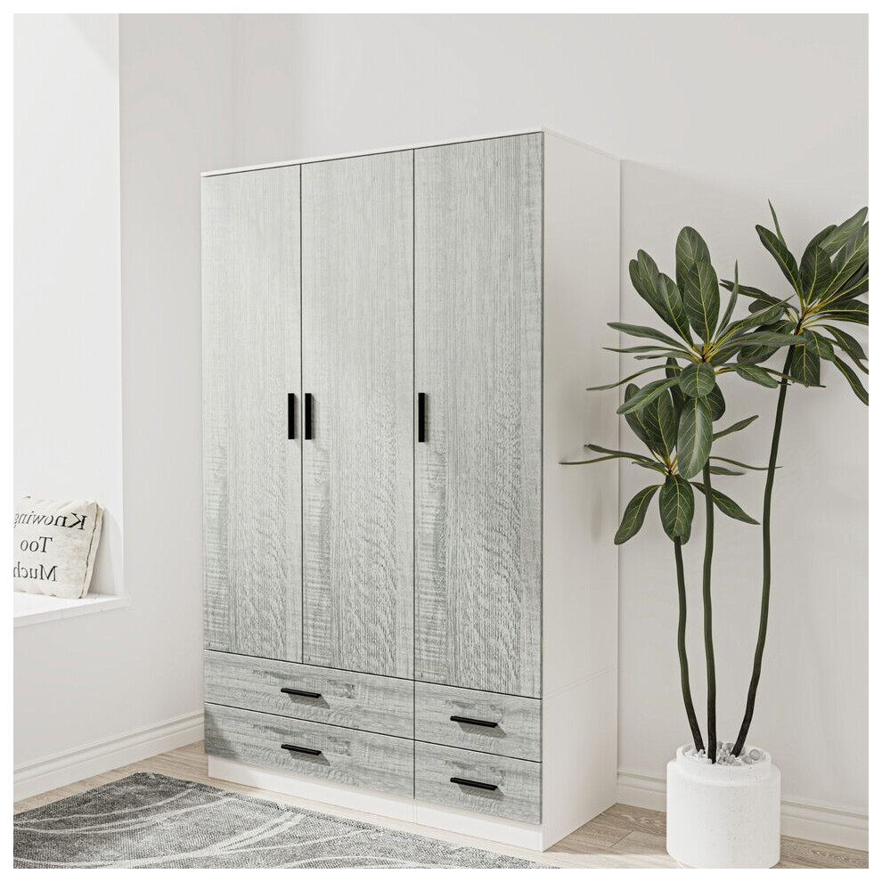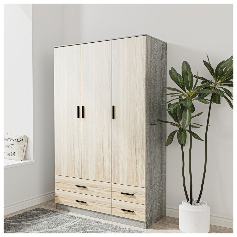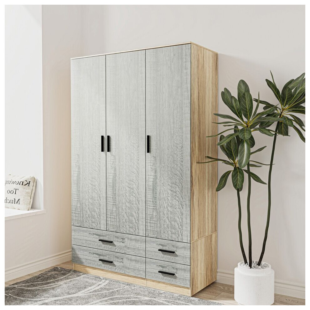 (Oak & Ash Grey) 3 Door 4 Drawer Wardrobe Storage Shelf Hanging Bedroom Modern Furniture