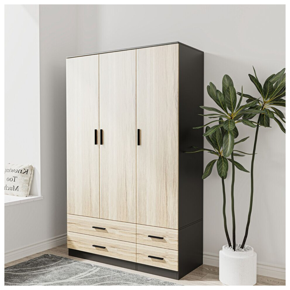 (Black & Oak) 3 Door 4 Drawer Wardrobe Storage Shelf Hanging Bedroom Modern Furniture