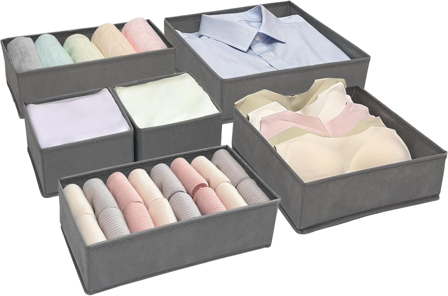 6Pack Drawer Organiser Foldable, Grey Fabric Drawer Dividers, Wardrobe Storage