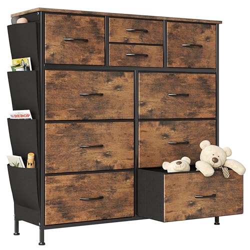 Buluri Chest of Drawers Bedroom, 12 Fabric Drawers Dresser with Side Pockets and Hooks, Wooden Top and Metal Frame, Tall Drawers for Closet, Living room, Kids Room (Rustic Brown)