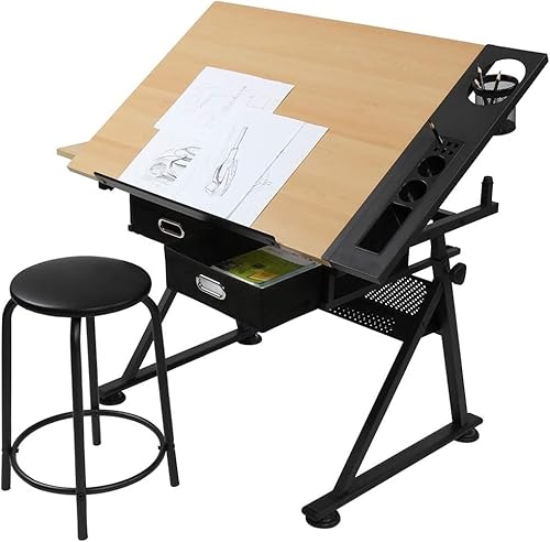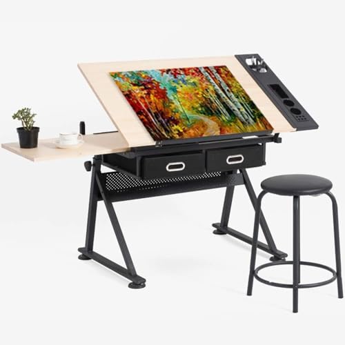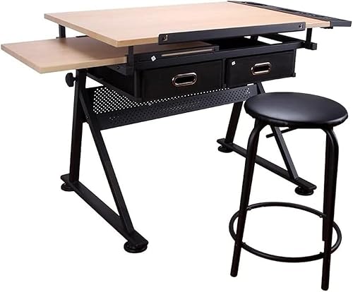 costoffs Adjustable Height Drafting Table Drawing Table Art Desk for Artist with 2 Drawers and Tiltable Tabletop, Black Artist Table with Stool for Painting/Crafting/Work/Study