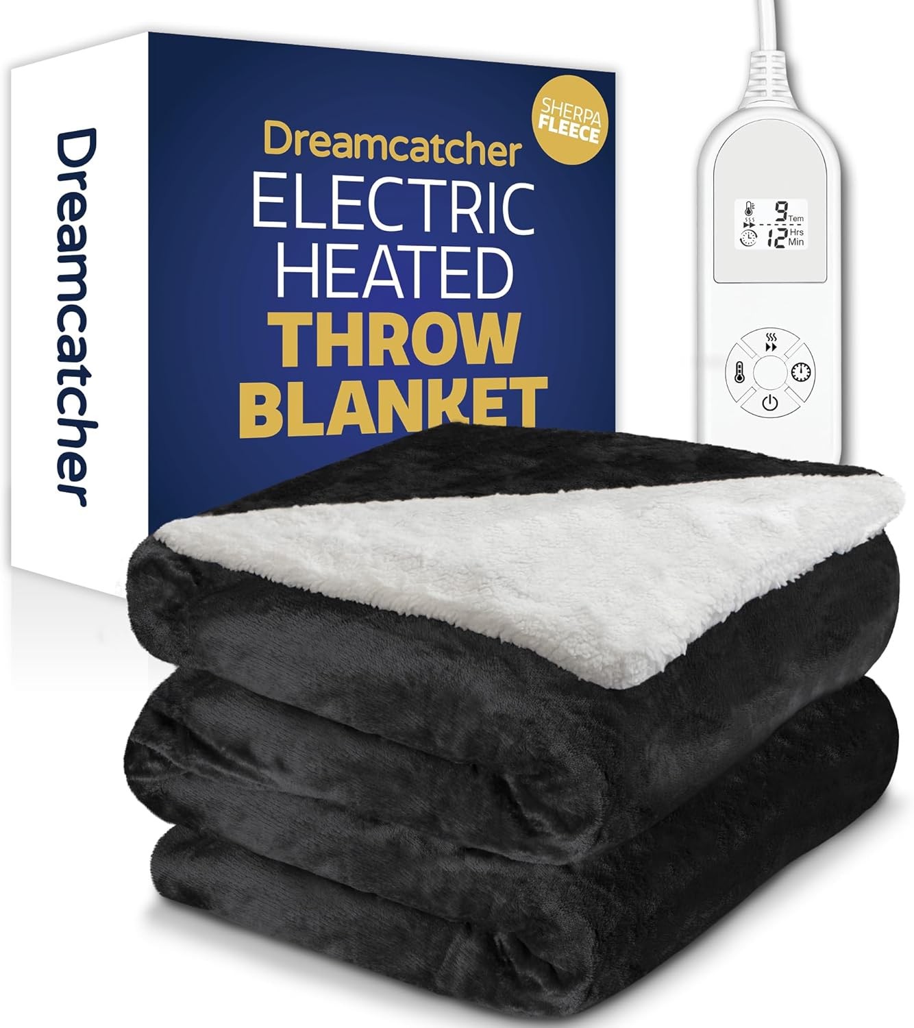 Dreamcatcher Black Heated Throw Electric Blanket, 160 x 120cm Heated Blanket Machine Washable Soft Micro Fleece & Sherpa Electric Throw Overblanket with 12HR Timer and 9x Control Heat Settings