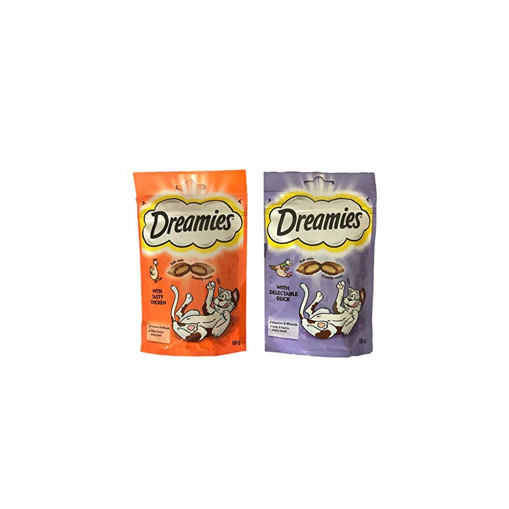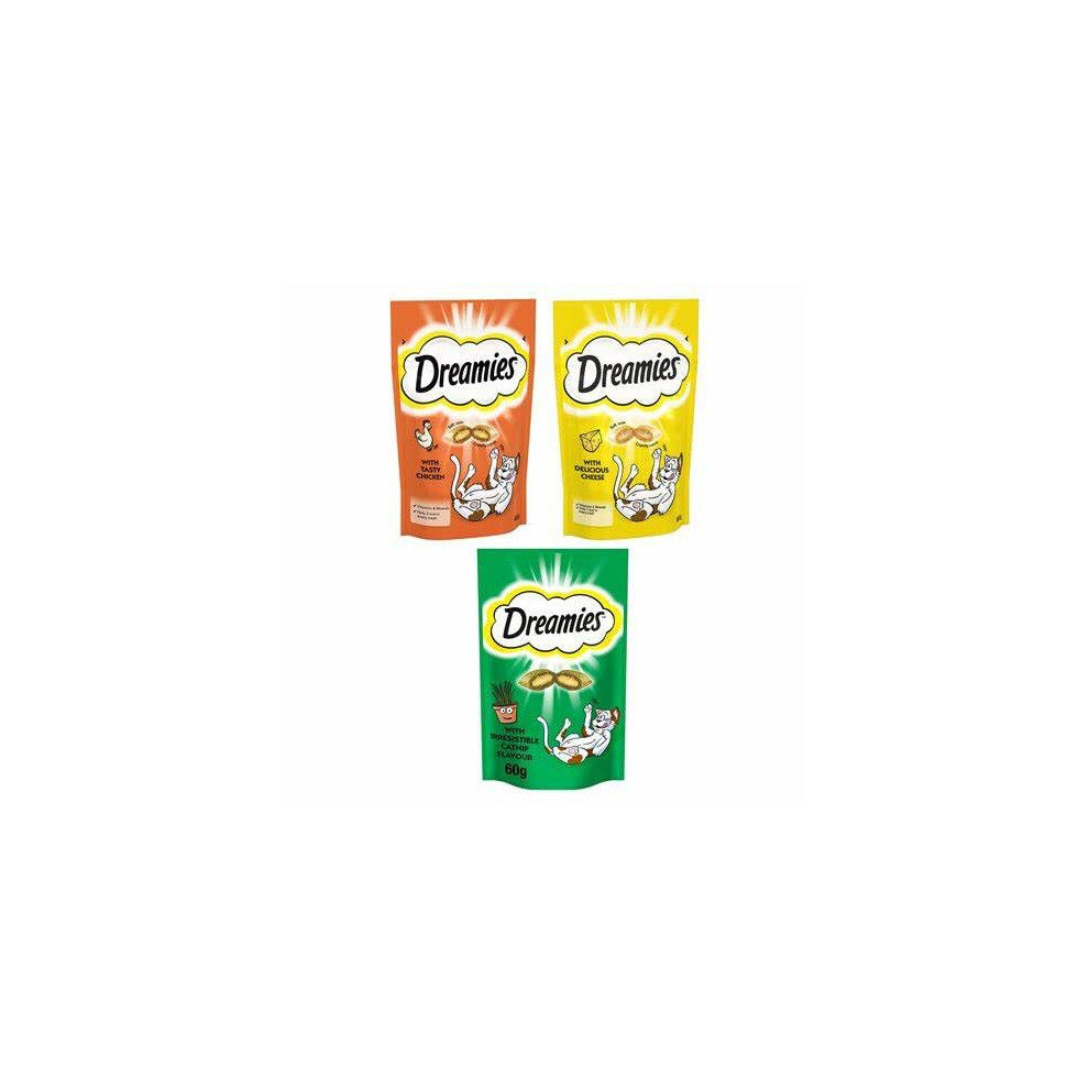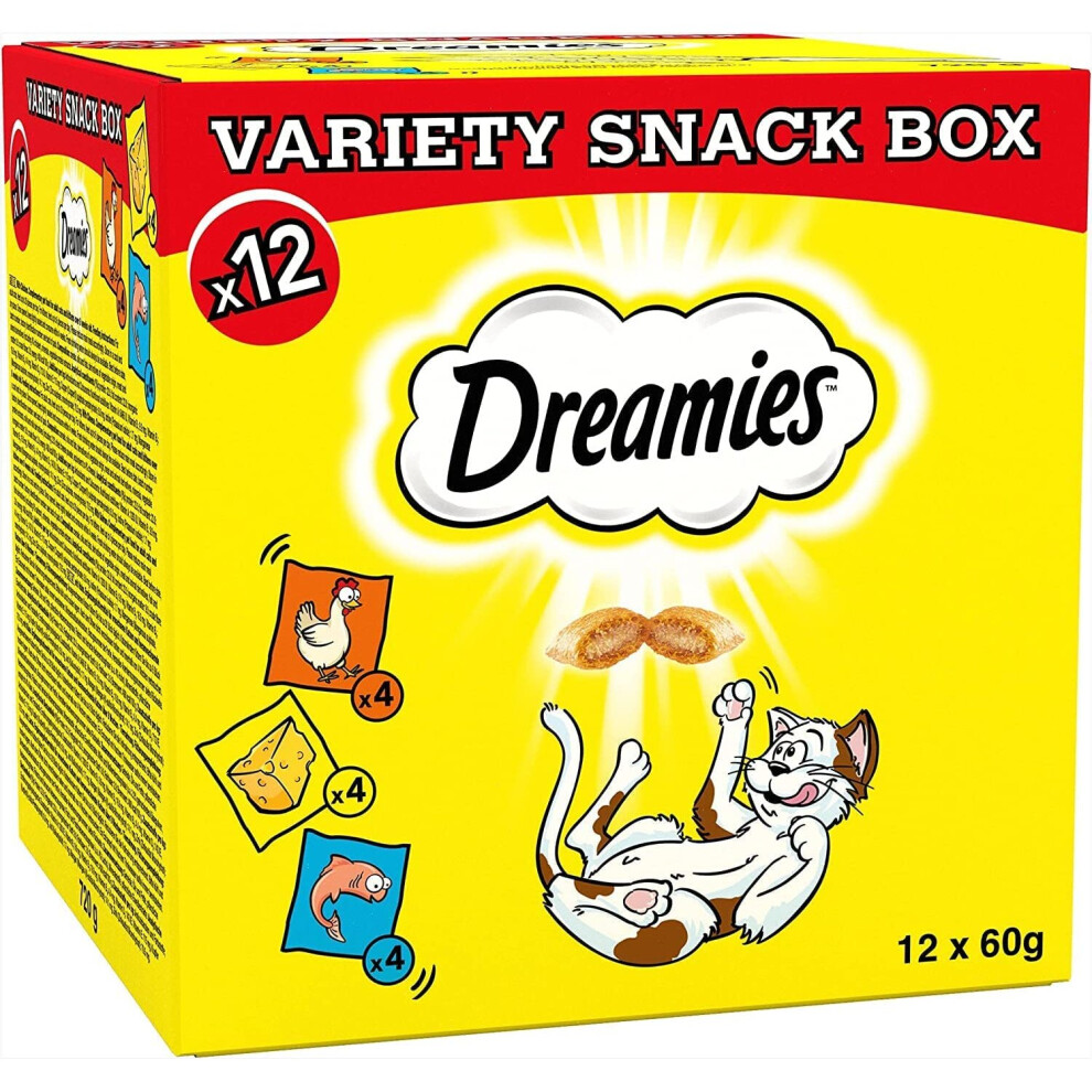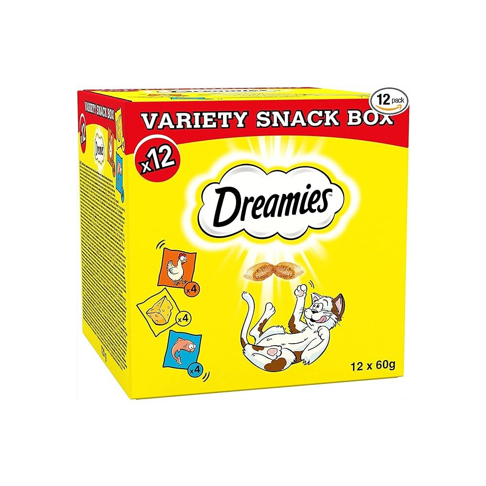Dreamies Variety Snack Box , 60 g Pouches, Cat Treats Tasty Snacks with Delicious Chicken, Salmon and Cheese Flavours, (12x60g))