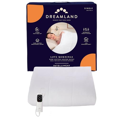 Dreamland Love Mornings Heated Duvet – Pure Cotton Cover, Single Size 200×135cm, 6 Heat Settings, Rapid Heat-Up, 1 Detachable Control & Auto Safety Shut-Off, All-Season Use Electric Blanket
