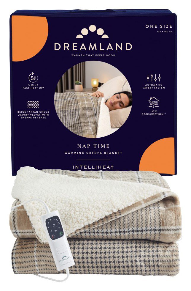 Dreamland Nap Time Heated Electric Blanket – Throw with 6 Heat Settings, Fast Heat Up, Auto Timer for Heat protection, Machine Washable - Velvet Sherpa Beige Tartan Check - 180 x 135 cm