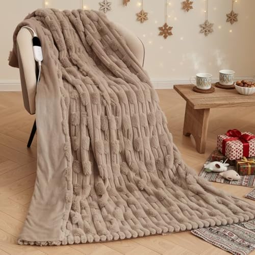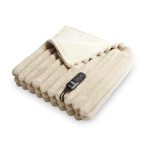 CURECURE Heated Blanket Electric Throw 130x180cm, 3D Bamboo Joint Faux Rabbit Fur & Flannel, 6 Heat Settings & 1-10H Timer Auto-Off, Machine Washable Electric Blanket for Bed Sofa Office, Linen