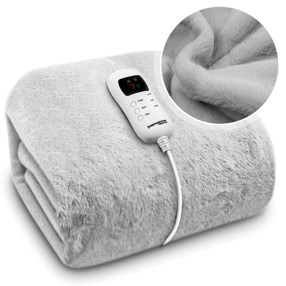 Dreamcatcher Light Grey Heated Throw Faux Fur Electric Blanket 160 x 130cm Thermal Blanket & Timer 9 Heat Settings