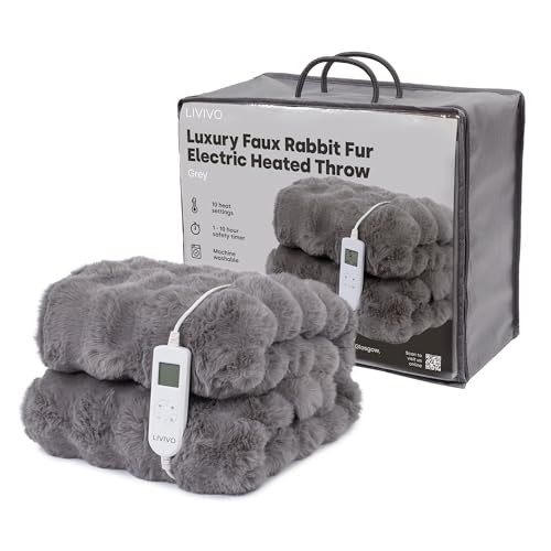 LIVIVO Faux Rabbit Fur Electric Heated Throw, 160x130cm – Plush Soft Blanket with 10 Heat Levels, Auto Shut-Off, Overheat Safety & Machine Washable Design - Grey