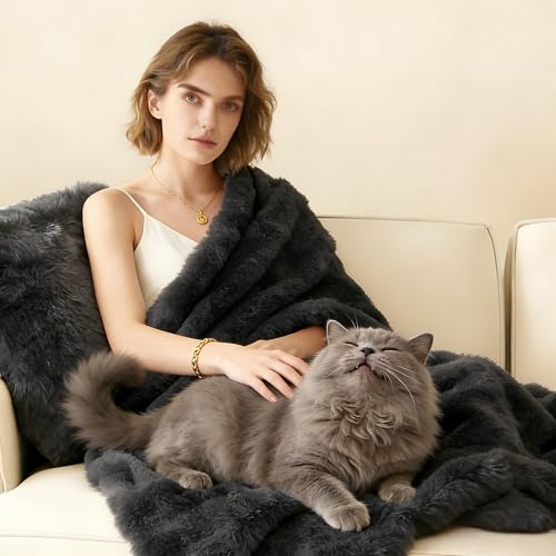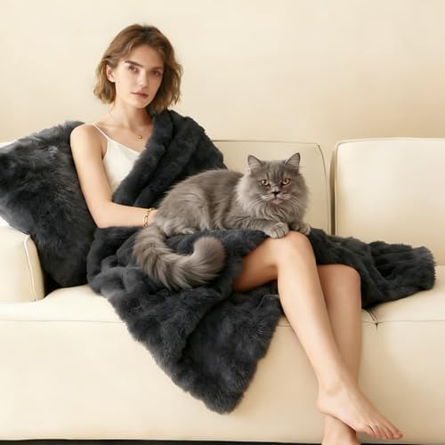 hvuioe Heated Throw, 160x130cm, Plush Soft Faux Rabbit Fur Electric throw for Bed Sofa Office, Fast Heat Up, Auto Shut Off, Overheat Protection, Machine Washable, grey