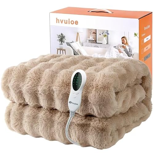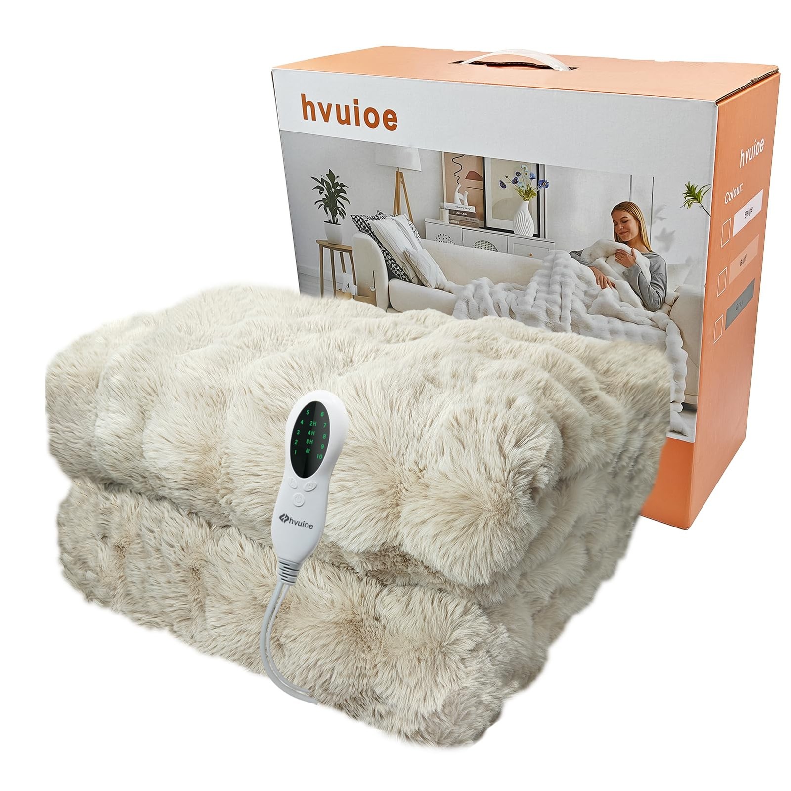 hvuioe Faux Rabbit Fur Heated Throw, 160x130cm, 10 Heat Settings Electric Throw, 3 Temperature Timer with Auto Shut Off, Overheat Protection Electric Blanket, Machine Washable, Buff