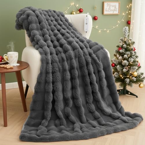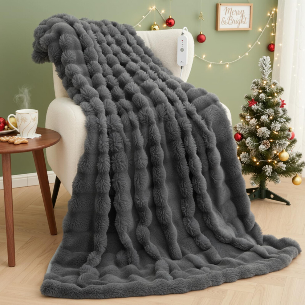 CURECURE Heated Blanket Electric Throw 130x180cm, Soft 3D Bubble Faux Rabbit Fur & Flannel, 4 Heat Settings & 10H Auto Off, Machine Washable Electric Blanket for Bed Sofa Office, Gray