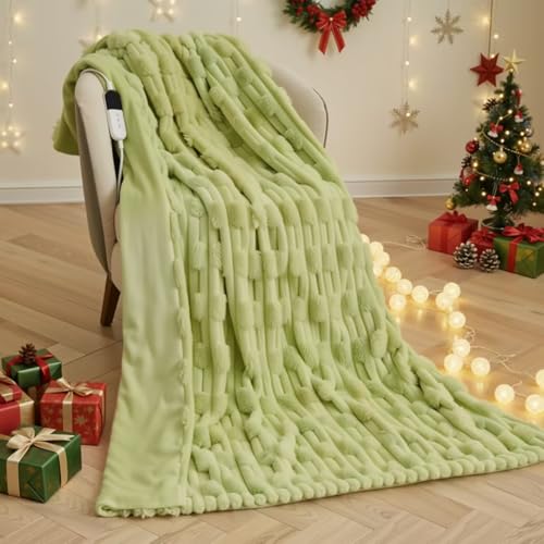 CURECURE Heated Blanket Electric Throw 130x180cm, 3D Bamboo Joint Faux Rabbit Fur & Flannel, 6 Heat Settings & 1-10H Timer Auto-Off, Machine Washable Electric Blanket for Bed Sofa Office, Green