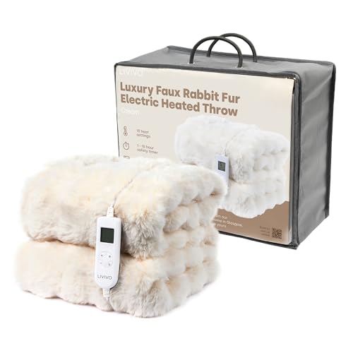 LIVIVO Faux Rabbit Fur Electric Heated Throws for Adults, 160x130cm – Plush Soft Electric Throw Blanket with 10 Heat Levels, Auto Shut-Off, Overheat Safety & Machine Washable Design - Cream