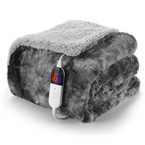 hvuioe Faux Rabbit Fur Heated Throw, 150x180cm, 10 Heat Settings Heated Blanket Throw, 3 Temperature Timer with Auto Shut Off, Overheat Protection Electric Blanket Throw, Machine Washable, Grey
