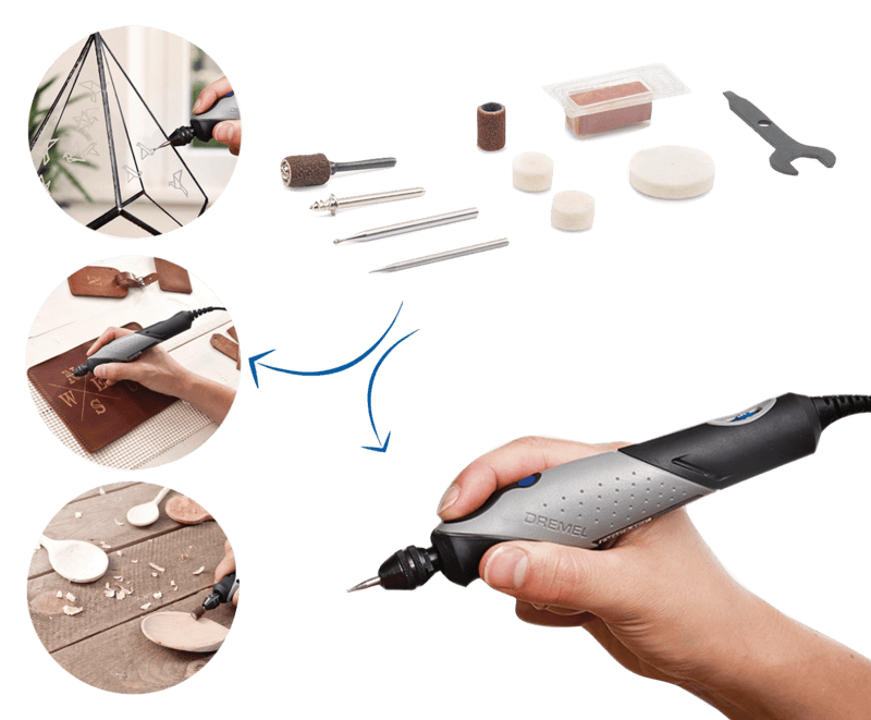 Dremel Lite 7760 Battery Multi tool 3.6V, Set with 15 Accessories and Dremel 930-18 Hot Glue Gun for Carving, Engraving, Grinding, Sharpening, Cleaning, Gluing.