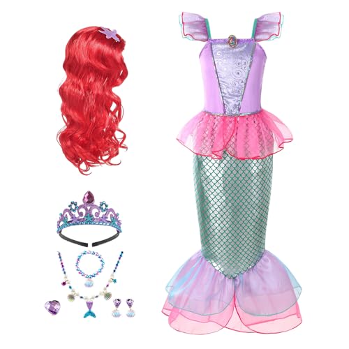IWEMEK Girls Fancy Dress Little Mermaid Ariel Costume Princess Dress Up Gown with Accessories Kids Fairy Tales Cosplay Fancy Party Outfits Halloween Carnival Costumes Purple Bowknot 5-6 Years