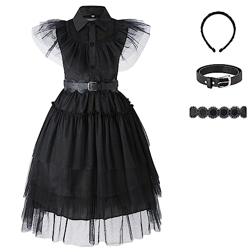 Boodtag Wednesdays Addams Costume Dress Princess Dress with Belt Addams Family Halloween Girls Costume Carnival Fancy Dress Outfit Black 5-6 Years