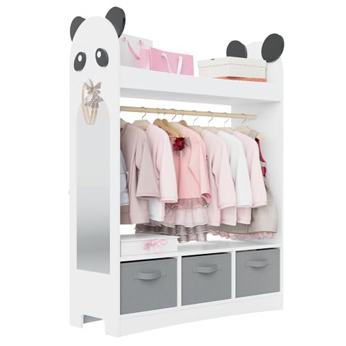 Hironpal Kid Dress Up Storage with Mirror Kids Wardrobe Dressing Up Rail Open Hanging Costume Armoire Closet Pretend Storage Organizer Children Clothes Center for Girl Bedroom (panda,3 drawer,white)