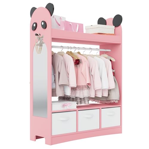 Hironpal Kid Dress Up Storage with Mirror Kids Wardrobe Dressing Up Rail Open Hanging Costume Armoire Closet Pretend Storage Organizer Children Clothes Center for Girl Bedroom (panda,3 drawer,pink)