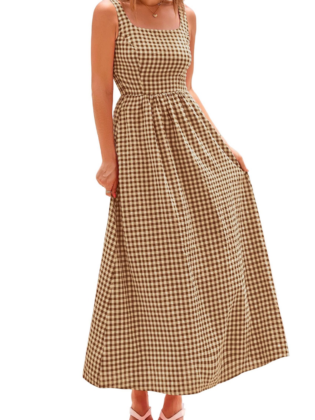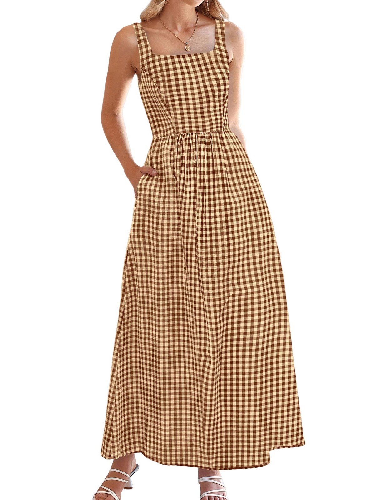 4X(Women'S 2025 Summer Spaghetti Strap Maxi Dresses Plaid Square Neck A9173