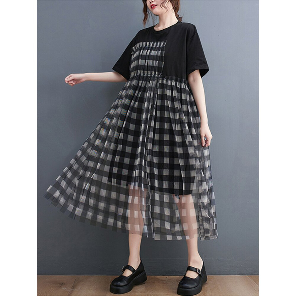 Patchwork Mesh Plaid Dresses For Women Short Sleeve Loose Casual Vintage Midi Summer Dress Clothing