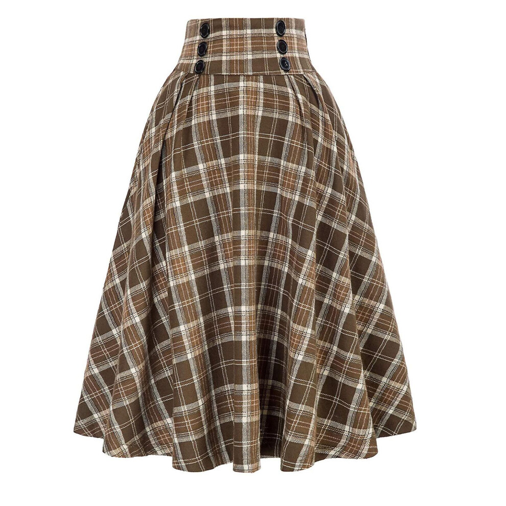 (Yellow, M) Womens Dresses Women Fashion Plaid Printing With Buttons Vintage High Waist Pleated Skirt Women's Skirts