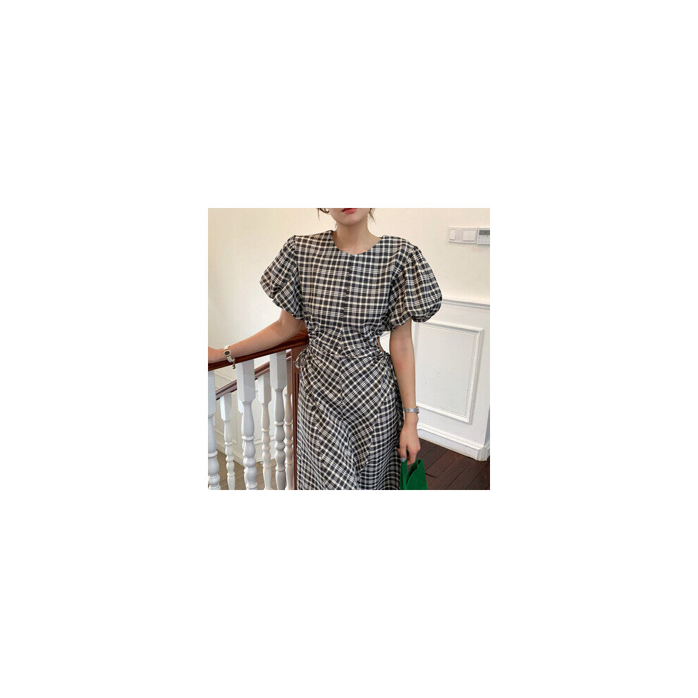 O Neck Puff Short Sleeve Summer Dress Women Lace Up Hollow Out Waist Dresses Temperament Plaid Robe Femme