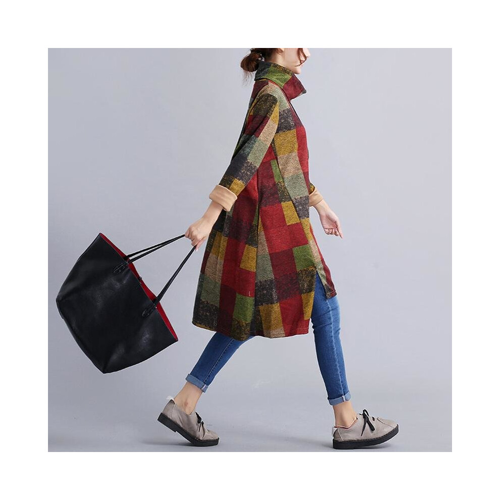 Winter Dresses Women Plaid Print Turtleneck Irregular Full Dress Vintage Woolen Women Long Sleeve Dress Size M-2XL
