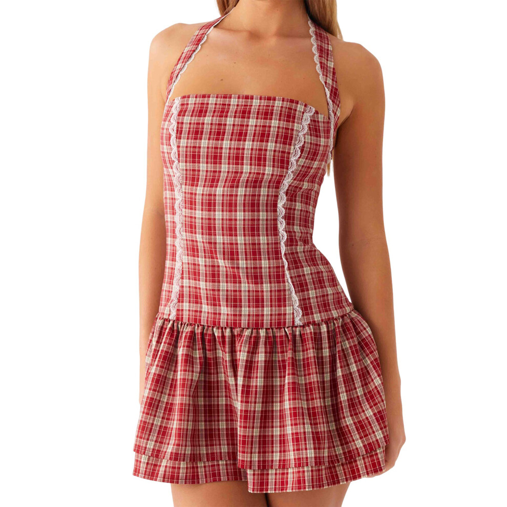 (M, Red) Women Halter Neck Mini Dress Lace Patchwork Double Layered Hem Backless Summer Plaid Dresses