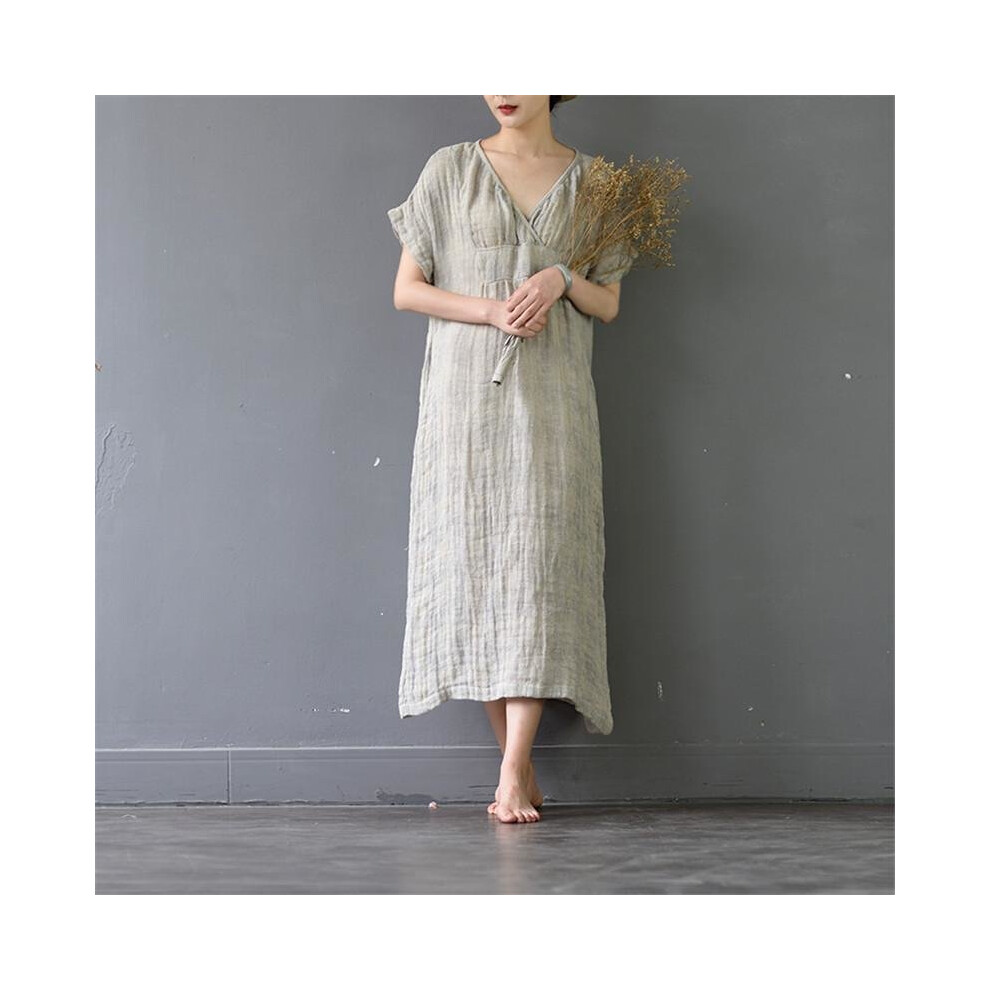 Summer Dresses Vintage Plaid V-neck Short-sleeve Loose Long Linen Dress for Women Casual A-line Robe Femme S382