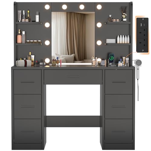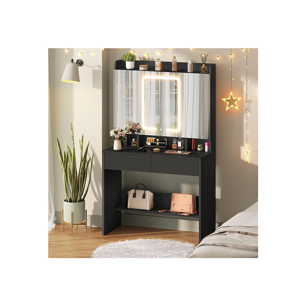 YuuSsea Black Oak Dressing Table with Mirror and LED Lights, Engineered Wood Makeup Vanity with Storage, Modern Bedroom Vanity Desk for Daily Grooming