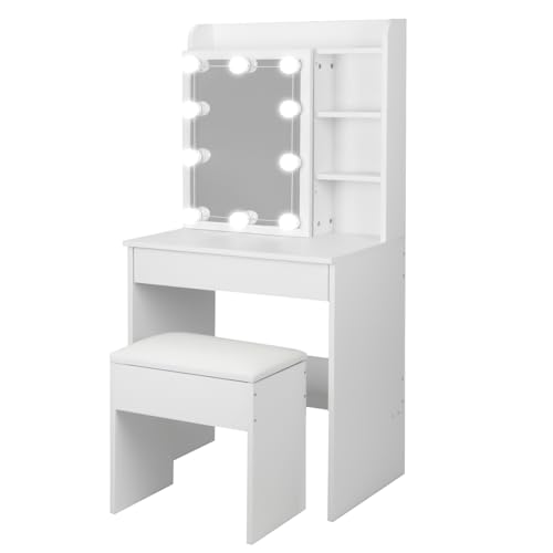 CLIPOP Small Dressing Table with Mirror Adjustable LED Lights, White Vanity Desk with 2 Drawers and 4 Open Shelves, 60cm Compact Makeup Table for Bedroom Girls Women