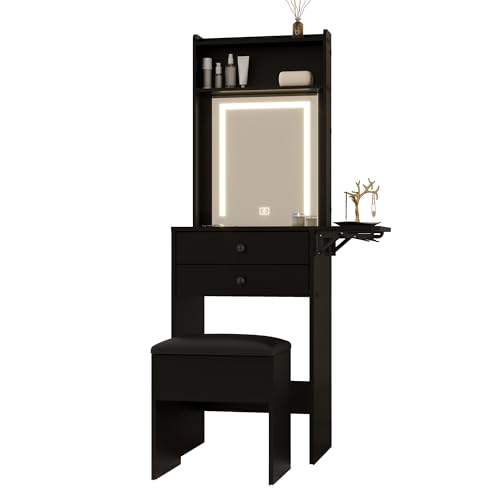 Dressing Table with Mirror and LED Lights, Makeup Table with 2 Drawers & shelves, Compact Small Vanity Desk Set with Fold-up Panel, Cushioned Storage Stool for Bedroom (Black)