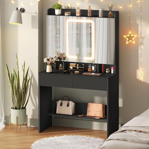 Fogcroll Dressing Table with Mirror and LED Lights, 3 Color Modes & Adjustable Brightness, Small Vanity Desk with Storage Drawer and 2 Open Shelves for Bedroom, Modern Vanity Table Makeup Desk