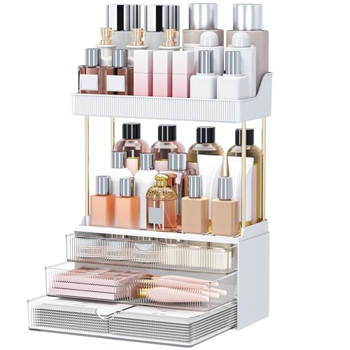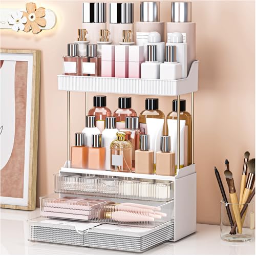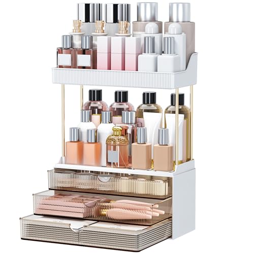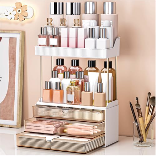 OrderlyGo Makeup Organiser - Upgrade 2 Tier 3 Drawers Large Vanity Organisers, Versatile Cosmetic Storage, Exquisite Bathroom & Skincare, Dressing Table Organiser, Amber