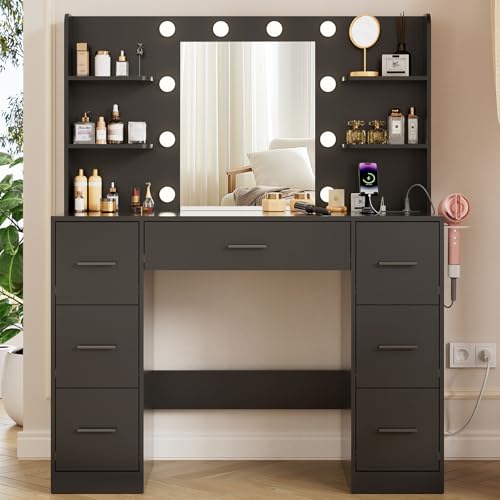 Airfish Dressing Table with Drawer,Vanity Table with LED Light and Power Outlet,Makeup Desk with Open Shelves for Bedroom,Modern Dresser (Black)