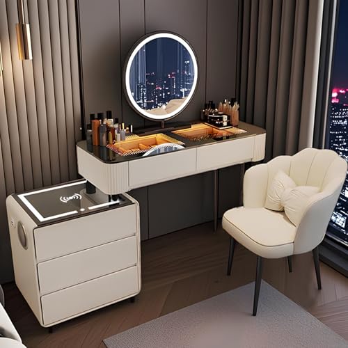 LIMENQIN Makeup Vanity Desk Set, Modern Vanity Table with Lighted Mirror, Dressing Table with Storage Drawers and Vanity Stool, Bedroom Wood Makeup Tables(Style A,80cm/31.5in)