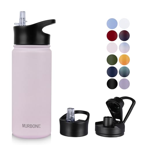 MURBONE Insulated Water Bottle, 500ml Stainless Steel Drink Flask with Straw, BPA Free, Leakproof Double Walled Vacuum Water Bottle - 2 Lids (Straw and Spout), Pink