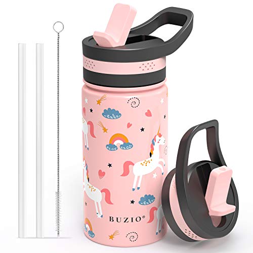 BUZIO Insulated Water Bottle for Kids, Toddler Water Bottle Modern Vacuum Insulated with 2 Straw Lids, 400ml Double Walled Wide Mouth Sports Drink Flask with Pink Unicorn Patterns