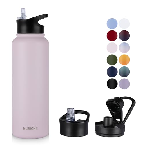 MURBONE Insulated Water Bottle, 1.2L Stainless Steel Drink Flask with Straw, BPA Free, 2 Lids (Straw Lid and Spout Lid), Leakproof Double Walled Vacuum Water Bottle, Pink