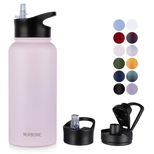 MURBONE Insulated Water Bottle, 1L Stainless Steel Drink Flask with Straw, BPA Free, Leakproof Double Walled Vacuum Bottle with 2 Lids (Straw and Spout), Pink