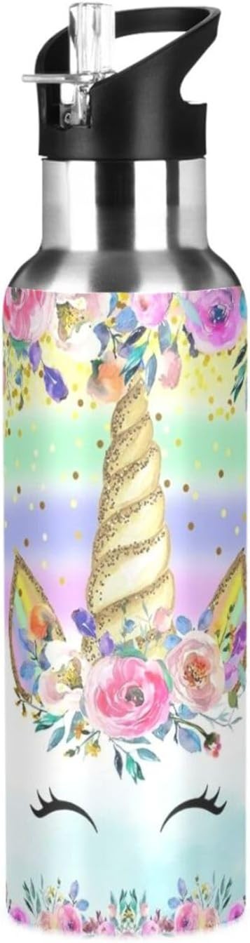 Unicorn Pink Water Bottle for Girls Kids Stainless Steel Drink Flask Straw Vacu