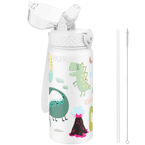 GOPPUS 420ml/14oz Kids Insulated Water Bottle with Straw Cute Double Wall Stainless Steel Child's Small Flask Vacuum Insulated Steel Metal Leak Proof Drink Flask Boys Toddler Girls Bottles BPA-Free