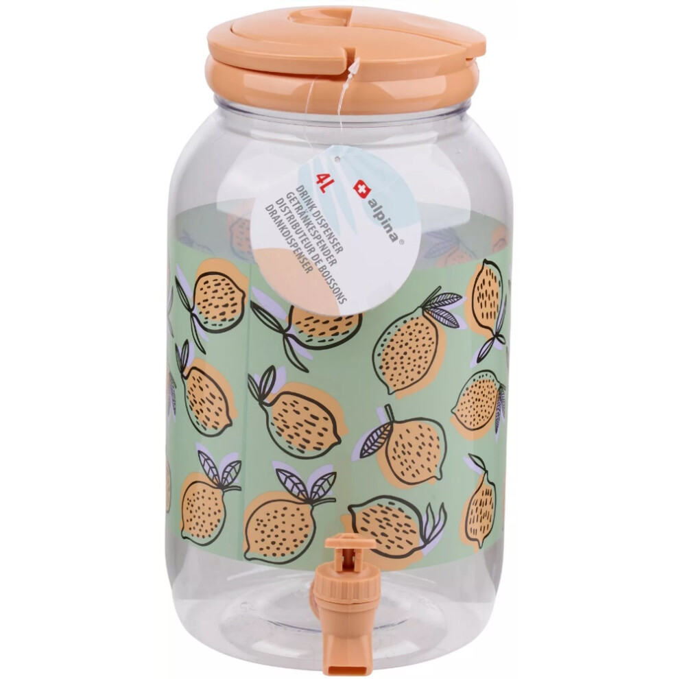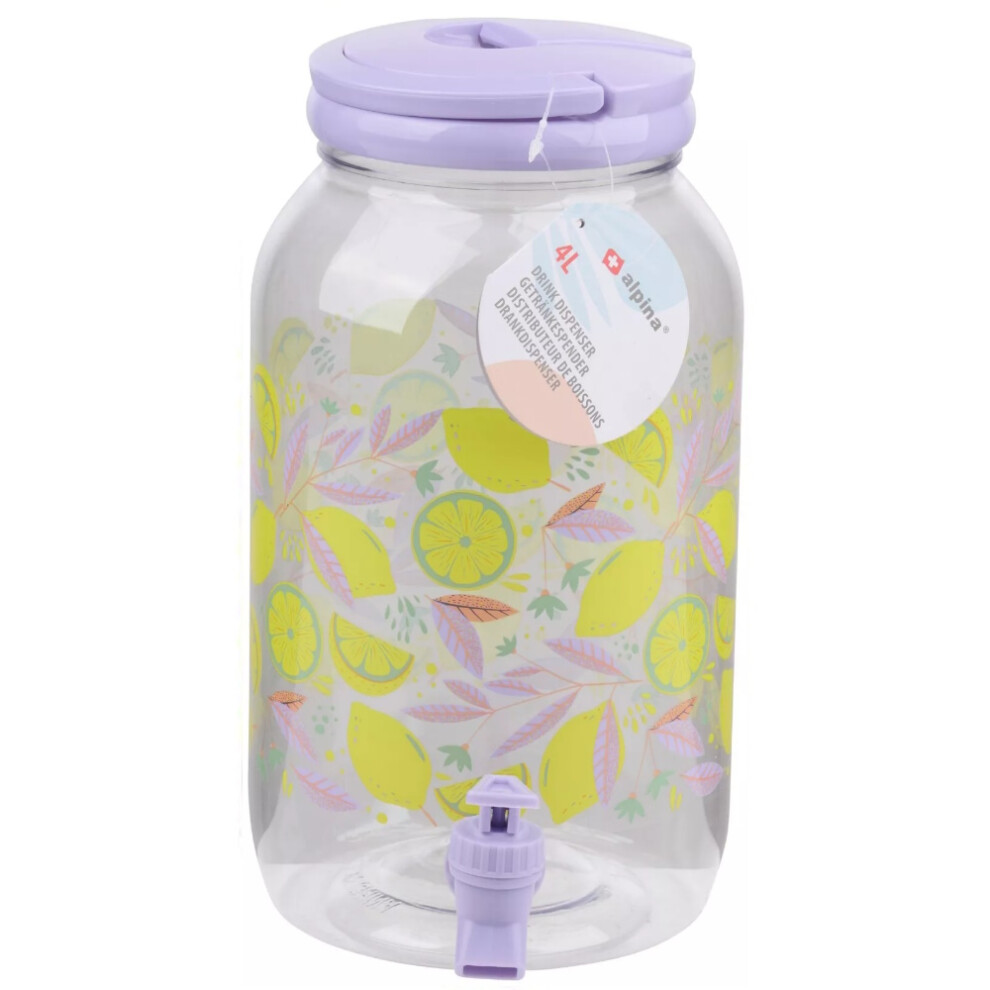 (Purple (Lemons)) 4 Litre Plastic Drink Dispenser with Tap & Lid Cocktail Punch Juice Beverage BBQ