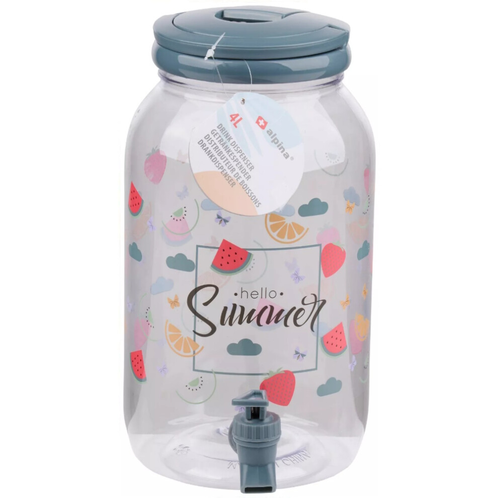 (Grey (Hello Summer)) 4 Litre Plastic Drink Dispenser with Tap & Lid Cocktail Punch Juice Beverage BBQ
