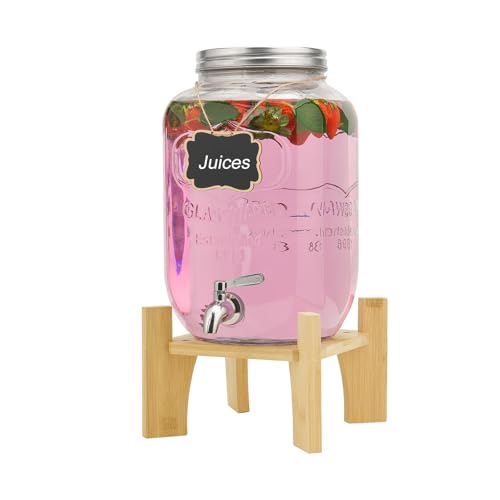 8L Glass Drink Dispenser with Stainless Tap, Glass Beverage Dispenser for Parties, Beverage Dispenser with Faucet and Bamboo Stand, Water Jug with Tap Perfect for Parties,Weddings,Birthdays