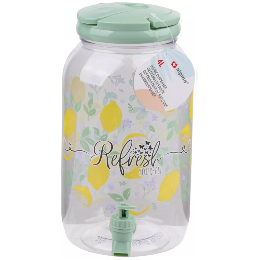 (Green (Refresh Yourself)) 4 Litre Plastic Drink Dispenser with Tap & Lid Cocktail Punch Juice Beverage BBQ