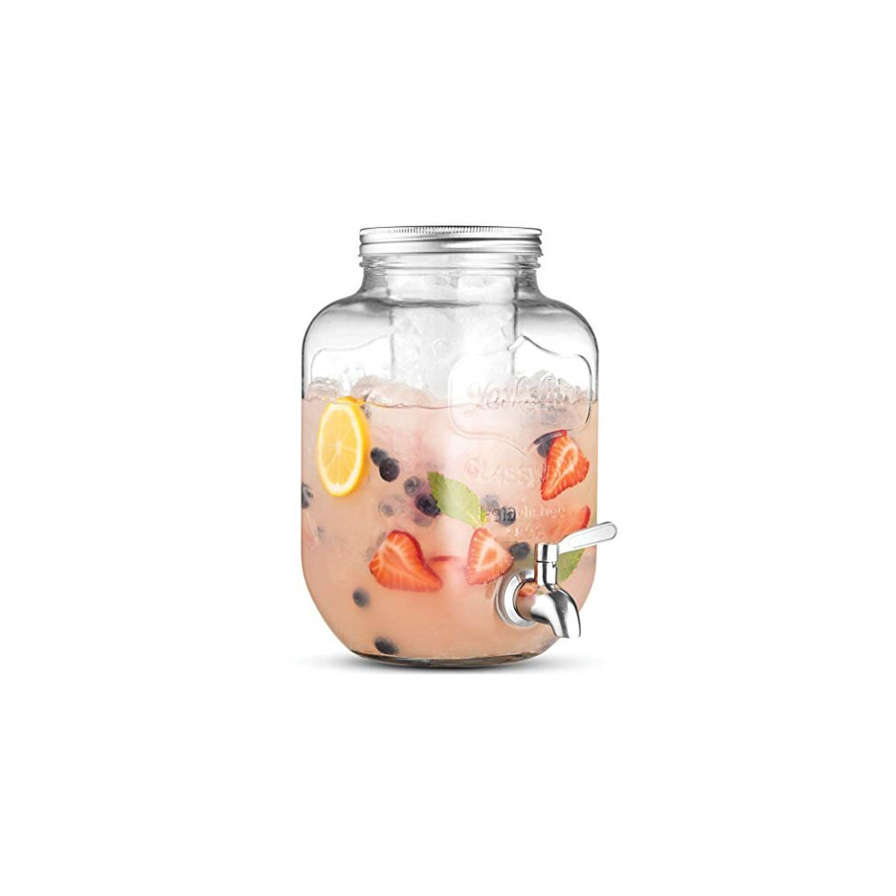Glass Drink Dispenser with Stainless Steel Tap 3.7L - 100% Leak Proof Beverage Dispenser with Ice Core, Easy Filling Wide Mouth - Glass Jug Cocktail Accessories, Mason Jar Water Dispenser & Metal Lid